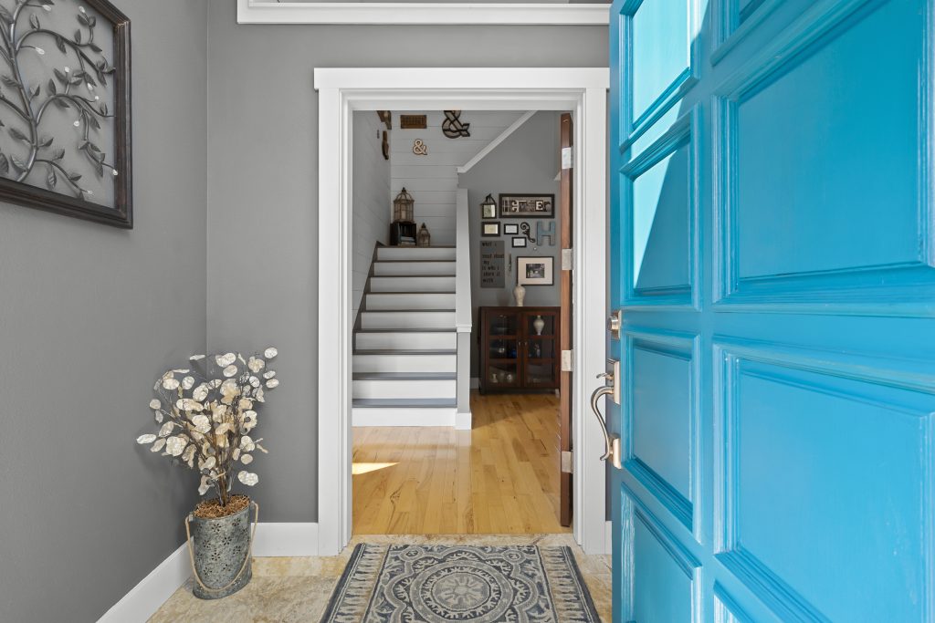 Travertine in front entry, powder room, laundry
