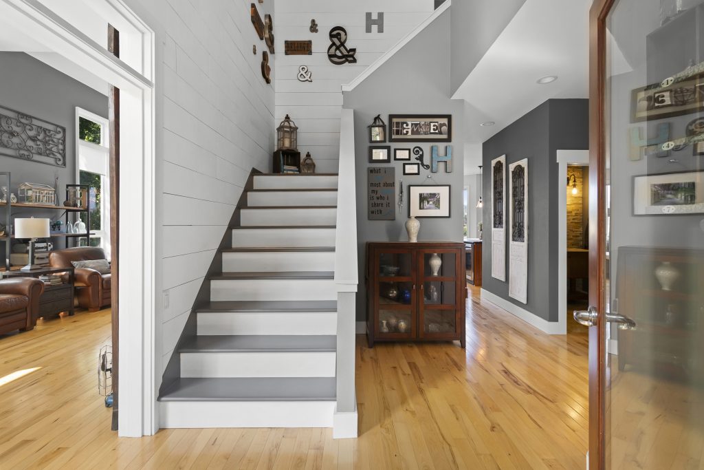 Upper level flooring replaced in all bedrooms and hallway – 3⁄4 inch medium brown solid hickory, hand scraped and factory finished.