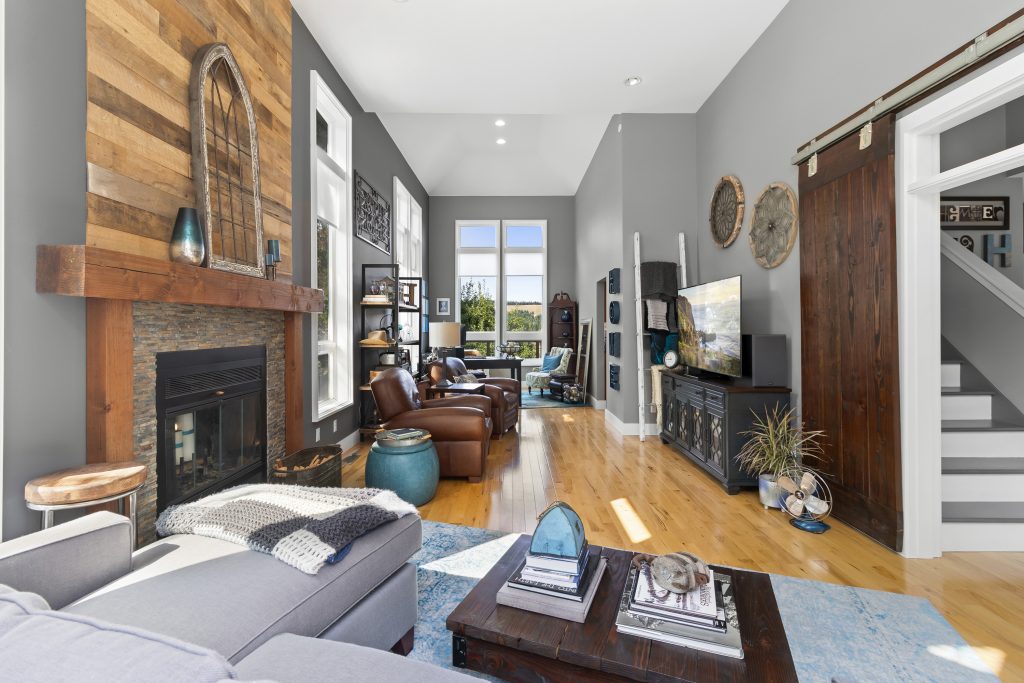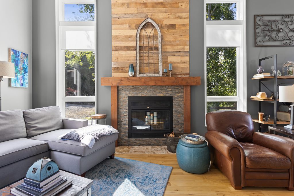 Living room – custom douglas fir mantle, stacked stone surround and feature wall for existing wood burning fireplace.