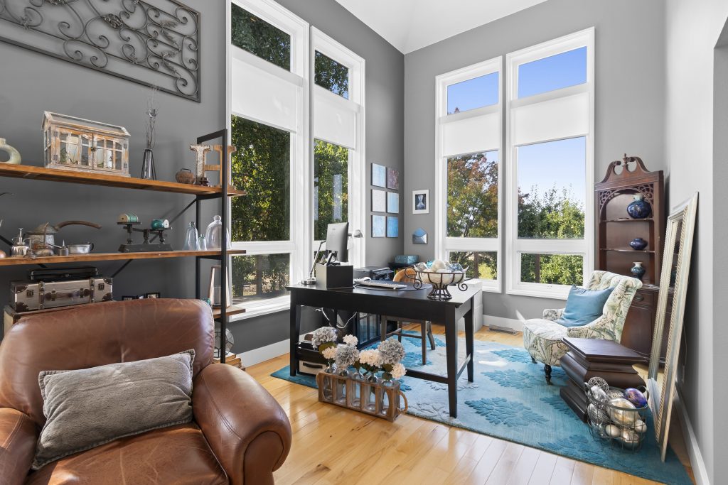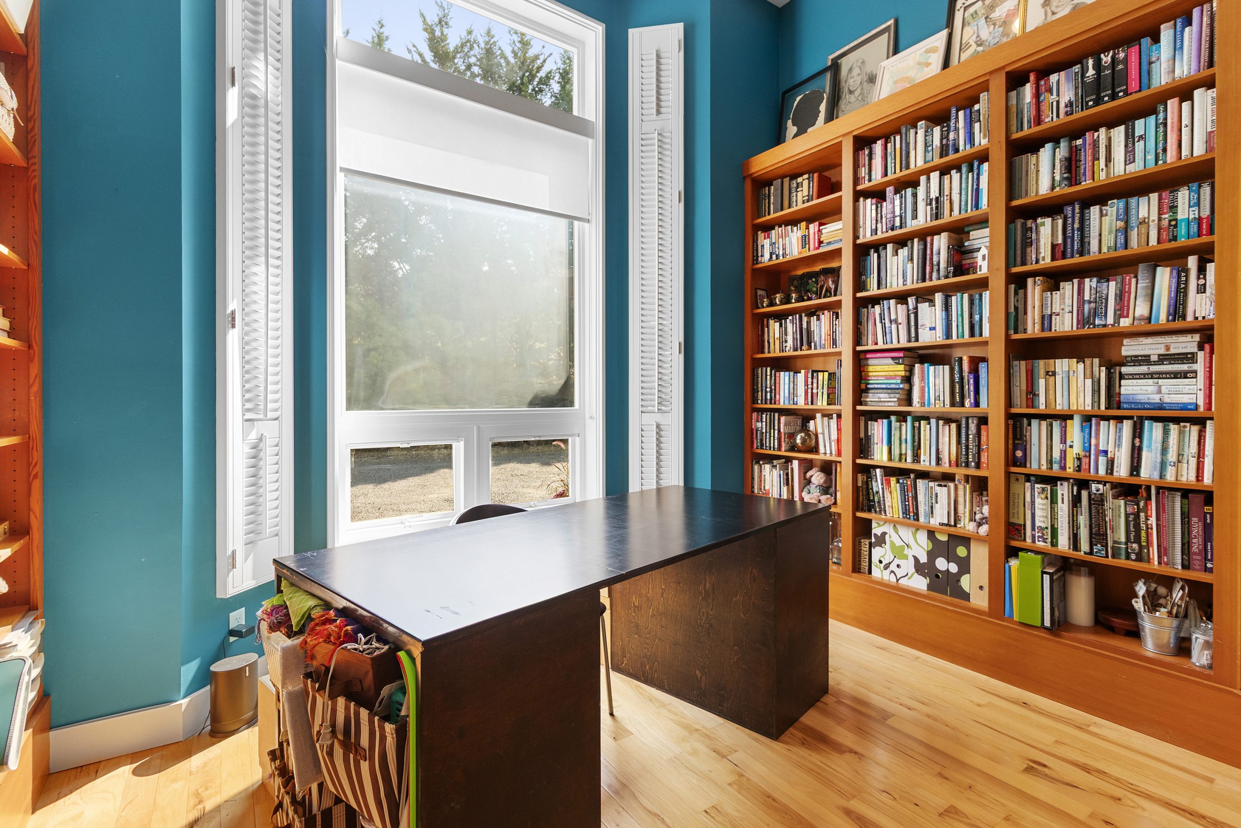 Custom built in window seat with storage in kitchen. Custom shades in living room, library.