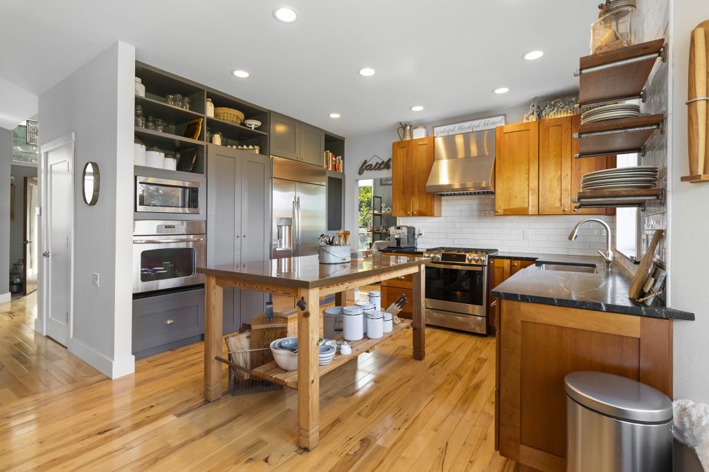 Kitchen – cherry cabinets, soapstone counters, custom island, apron front double sink, stainless high flow range hood with exterior fan unit. GE wall oven.