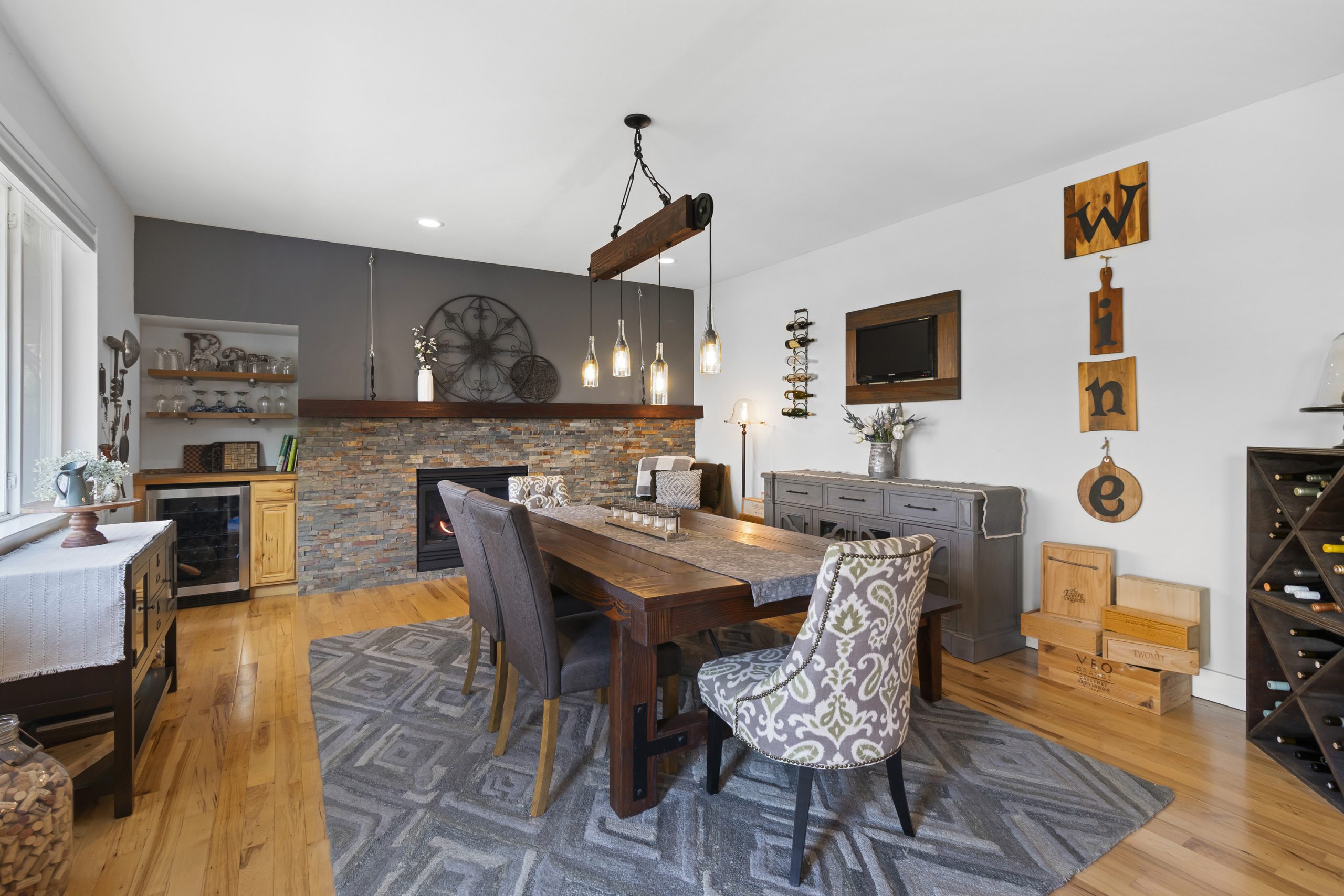 Custom douglas fir mantle and stacked stone surround on existing gas fireplace in dining/family room.