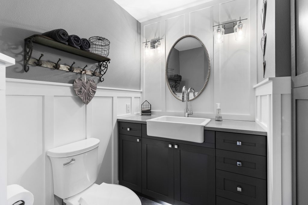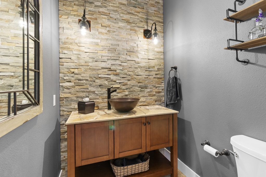 Powder room – vanity with copper vessel sink, stacked stone wall.