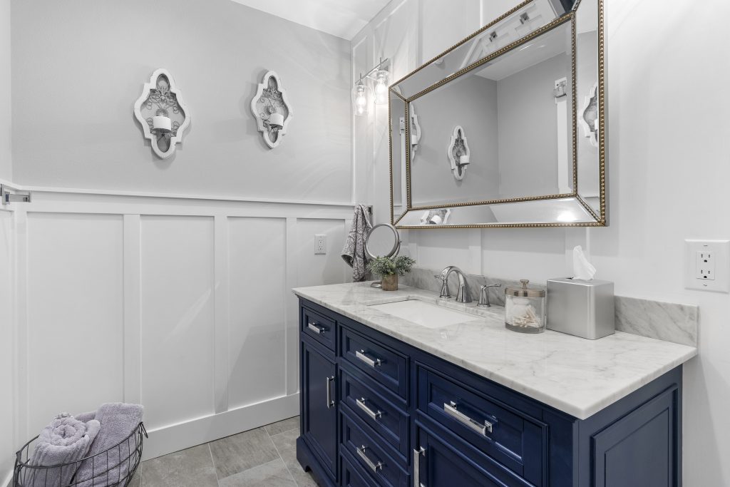 Upstairs hall bath – new tile floors, extra large shower, vanity, marble counter, wainscoting, Kohler full shroud toilet, Simmons shower valve.