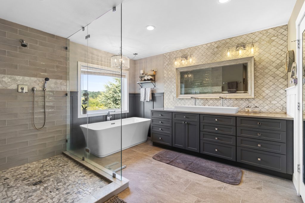 Primary bath – new tile floors, backsplash and extra large custom shower with glass partition, Simmons shower valve, Neptune free standing tub, double vanity with unique oversized vessel sink, quartz counter, wainscoting, Kohler full shroud toilet, Hansgrohe tub filler and faucets. Additional vanity and farm style sink in water closet.