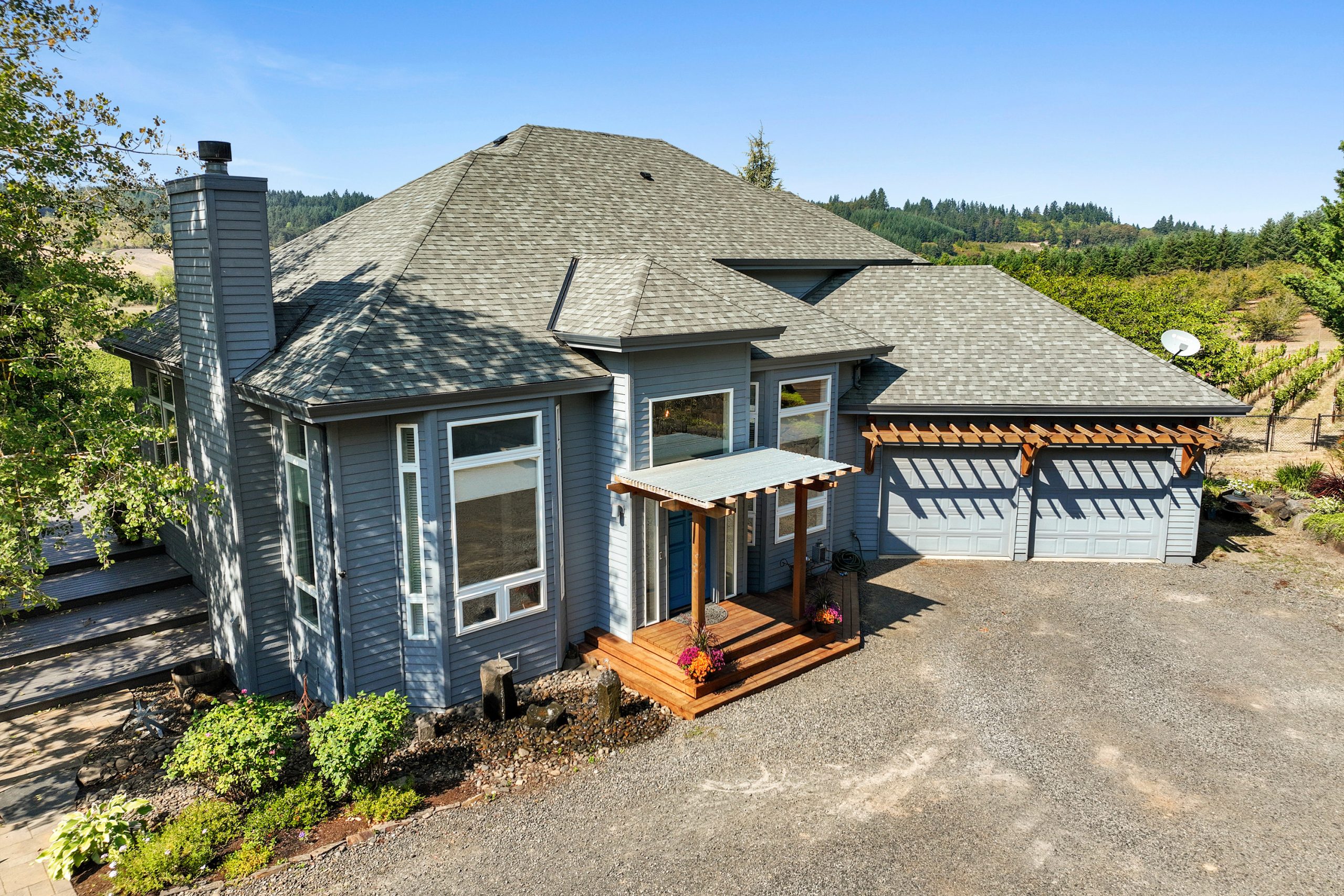 The home is incredibly well maintained and updated throughout, welcoming visitors with a two story entry leading to the vaulted living room with floor to ceiling windows. Large, gourmet kitchen with soapstone countertops, island, 2 ovens (one built-in, 1 in range) cherry cabinetry and window seat. Built in cabinetry plus 2 fireplaces (1 propane, 1 wood burning). Impressive primary suite with amazing views, large walk in closet, sprawling en-suite bath and detached water closet. Exercise room off of the garage offers flex space and was formerly used as an office. Relax on the expansive deck and take in the beautiful sunsets overlooking the vineyard. Large fenced garden with irrigated raised beds. Mature landscaping anchored by a picturesque stream/pond water feature. In addition to planting the vineyard and securing winery entitlement the current owners have remodeled and upgraded the home consistently over the years: